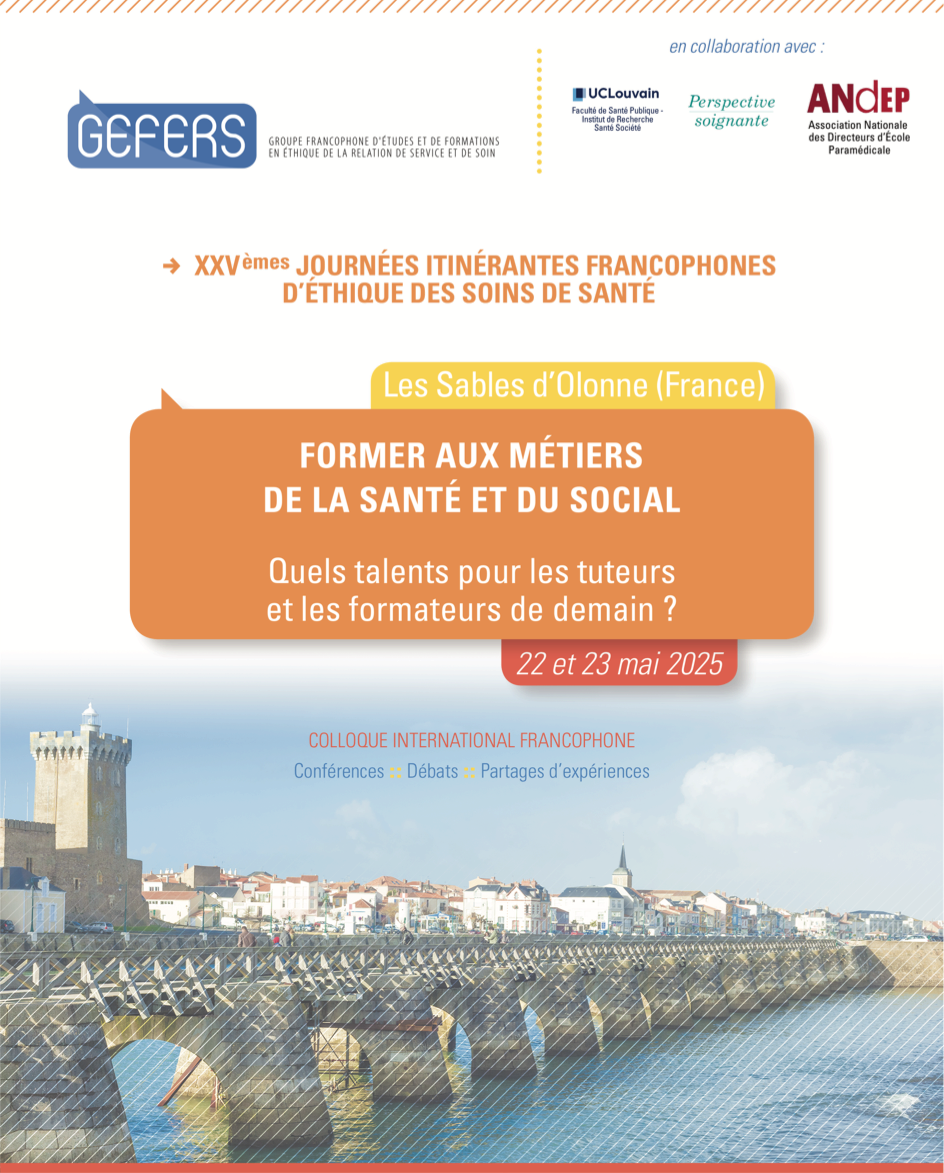 Les Journées itinérantes francophones d’éthique des soins de santé sont organisées par le GEFERS dans une région ou un pays en collaboration avec des partenaires locaux. Elles s’adressent à tous les professionnels du système de soins sans distinction de qualification. Elles concernent tous les lieux de la pratique tant dans les différents types d’établissements de soins, qu’en cabinet individuel et de groupe ou à domicile.
